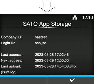 • When [Upload log data] is displayed, there is a print log which has not been uploaded to SATO App Storage. All the print logs which have not been uploaded to SATO App Storage are uploaded if [Upload log data] is selected.