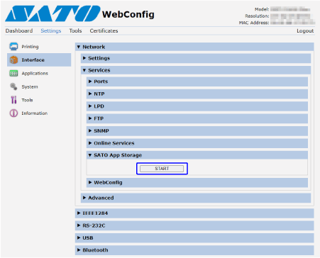 On the [Settings] page of the web configuration page, go to [Interface] > [Network] > [Services], then click [START] in the [SATO App Storage] menu to display the [SATO App Storage] page.