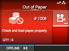 TOP > When You Are in Trouble > When an Error Message Appears > Error Message 1008 (Out of Paper) Error Message 1008 (Out of Paper) When there is an error with the product, the error message appears on the screen. Check the cause and countermeasure, and then take appropriate action. To clear the error: Load the media and open/close the print head, or press the button (OFFLINE) or the button. Cause and Countermeasure Reference Cause (1) The media is not loaded. Countermeasure (1) Load the media. Loading the Media Cause (2) The media is not loaded correctly. Countermeasure (2) Load the media correctly. Loading the Media Cause (3) The media sensor level is not set correctly. Countermeasure (3) Adjust the media sensor level. Cause (4) The media has jammed. Countermeasure (4) Remove the jammed media. Refer to the video for loading the media, for the media path, and for the operation of each part inside the product. Loading the Media Cause (5) The media sensor is not operating correctly. ◦ The media sensor is dirty, or there is a label attached to it. ◦ The media sensor has poor sensitivity. Countermeasure (5) Clean the media sensor. Contact your SATO technical support if the error cannot be resolved. Contact Information for When You Are in Trouble Back to top