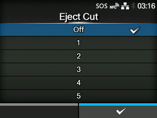 TOP > Various Settings of the Product > The Product's [Settings] Menu > [Printing] Menu > [Eject Cut] [Eject Cut] Set the Eject cut motion for the last printed media. Cut the last media after the specified timing. Appears if you have selected [Cut & Print] in the [Print Mode] menu. The setting range is Off, or from 1 to 5 (sec). Back to top
