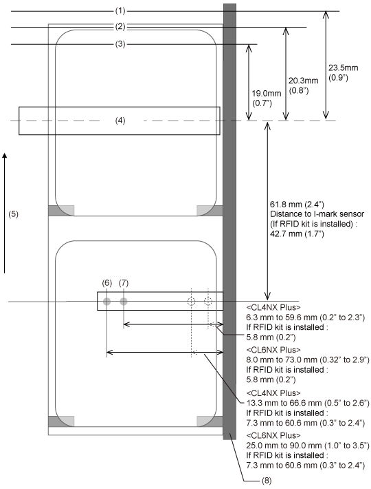 TOP > Adjusting the Product > Media Sensor Positions and Media Stop Positions Media Sensor Positions and Media Stop Positions The positions of the media sensors and the media stop positions with the various print modes are as follows: (1) Media stop position in dispenser mode (2) Media stop position in cutter mode (3) Media stop position in tear-off mode (4) Print head (5) Media feed direction (6) Gap sensor (7) I-mark sensor (8) Frame • If you use the notched media and when detecting the media position on the notched area, the dedicated parts are needed to be installed. By installing the dedicated parts, the moving range of the media sensor changes to inner side than the standard specification. If you adjust the media sensor position to the inner side, a false detection of the paper end may occur. In this case, change the setting of [Paper End] to [Using Gap] (Gap sensor). For details, contact your SATO sales representative or reseller. Back to top