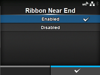TOP > Various Settings of the Product > The Product's [Settings] Menu > [Printing] Menu > [Ribbon Near End] [Ribbon Near End] Set whether to detect ribbon near end when the ribbon is nearing the end. When this setting is enabled and a ribbon near end is detected, this product operates as follows; • Printing does not stop. • The warning icon appears on the screen. • The ribbon near end state is output to returning the product status and external signal. Appears if you have selected [Use Ribbon] in the [Printing Mode] menu. The options are as follows: Enabled Enable detection of the ribbon near end. Disabled Disable detection of the ribbon near end. • The warning icon is shown in the status bar on the upper part of the screen. Back to top