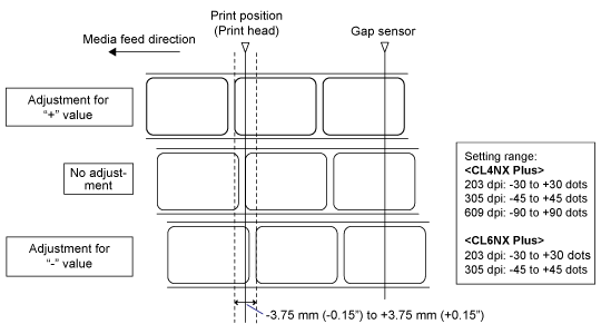 TOP > Adjusting the Product > Adjusting the Base Reference Point > Adjusting the Print Position Adjusting the Print Position Set the [Pitch] in the [Printing] > [Advanced] > [Adjustments] menu to adjust the print position. • The above reference position (print position) is the stop position when the media sensor type is set to Gap. 1. When the product is in Online mode, press the button on the operator panel to change to Offline mode. 2. Press the button to show the [Settings] menu. 3. Select [Printing] using the / buttons, and then press the button. 4. Select the [Advanced] > [Adjustments] > [Pitch] menu using the / buttons, and then press the button. The [Pitch] screen appears.5. Change the setting value. Press the /// buttons to select a number and then press the button to enter the number to the text box. The setting range is as follows:ResolutionCL4NX PlusCL6NX Plus203 dpi(1 dot = 0.125 mm (0.0049"))-30 to +30 dots-30 to +30 dots305 dpi(1 dot = 0.083 mm (0.0033"))-45 to +45 dots-45 to +45 dots609 dpi(1 dot = 0.042 mm (0.0017"))-90 to +90 dots-6. Press the button to save the setting value. 7. Press the button to change to Offline mode. 8. Press the button again to change to Online mode. You can print to check the adjusted print position. Back to top