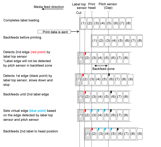 TOP > Adjusting the Product > Flow of Printing Operations > Operations When the Label Waste Prevention Function Is Enabled > Partial Cutter Mode, Backfeed Before Printing, and with Registered Label Length=0 (Auto) Partial Cutter Mode, Backfeed Before Printing, and with Registered Label Length=0 (Auto) Back to top