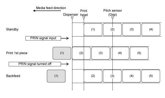 TOP > Adjusting the Product > Flow of Printing Operations > Operations in Dispenser Mode > Dispenser Mode, Backfeed After Printing with External Control (Release) Input, with Media Sensor Enabled, and with Pulse Input