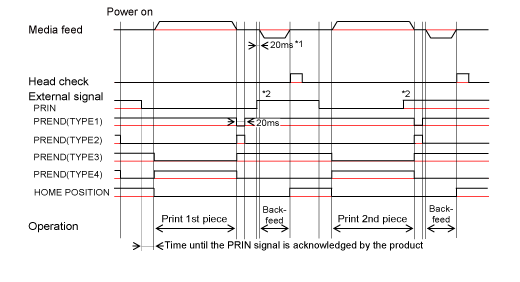 • Even if [Interface] > [External I/O] > [Print Start Signal] > [Signal State] is set to Falling edge or Rising edge, the signal detection at backfeed is equivalent to Low active or High active.