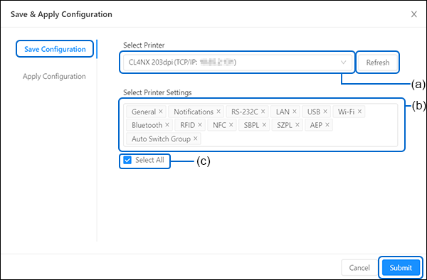 1. On the [Save Configuration] tab menu, select the source printer (a) and the printer settings (b) to be saved.Click the drop-down list and select the options. You can have multiple selections of the printer settings or select the [Select All] check box (c) to select all the printer settings on the list.