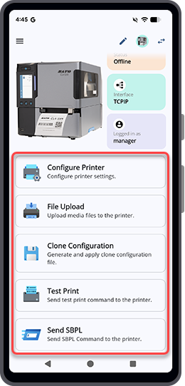 TOP > Various Functions of the Application Various Functions of the Application Printer Configuration Creating Printer Configuration File Applying the Configuration File Configuring Printer Directly File Upload Font Upload Package Upload Clone Configuration Creating a Clone Configuration File Applying the Clone Configuration Test Print Performing Test Print Using the Test Print Template Performing Test Print Using the Designated File Send SBPL Various Functions on the Send SBPL Screen Entering the SBPL Command Manually and Sending the Command to the Printer Sending the SBPL Command File to the Printer Printer Statistics Logger Retrieving Statistics Log When the Printer Is Powered Off Retrieving Statistics Log When the Printer Is Powered On/Standby Mode Exporting Statistics Logs Clearing the Statistics Log List Accessing Functions in the Mobile All-In-One Tool The Mobile All-In-One Tool offers various functions that can be accessed through different pages and menus within the application. Home page The Home page provides access to the printer configuration and other functions that use the NFC interface. For details on the list of available functions, refer to Home Page Overview. Printer Dashboard After connecting to a selected printer and logging in if required, the function buttons will become available on the printer dashboard. For details on the list of available functions, refer to Dashboard Overview. Side menu (Dashboard) On the printer dashboard or most function pages, tap the icon to open the side menu. The side panel displays a list of functions where you can switch without returning to the dashboard. For a full list of available options, refer to Side menu (Dashboard). The available primary functions are: Printer Configuration File Upload Clone Configuration Test Print Send SBPL Printer Statistics Logger Related Topics Navigating the Application